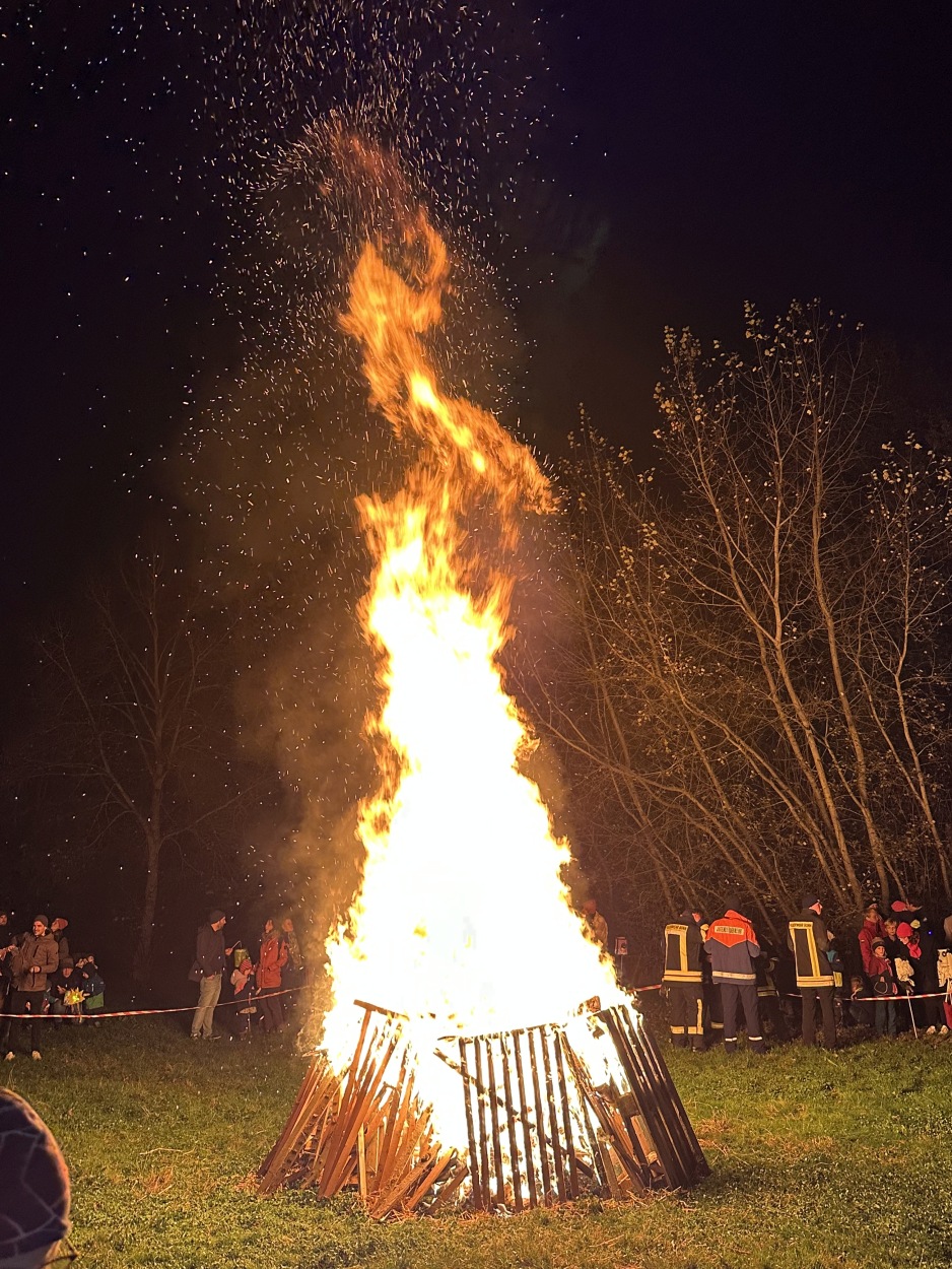 Nach dem leckeren Einstimmen bei Gebäck und Getränk ging es mit Kind und Kegel und viel Gesang durch den Ort. Am Ende traf man sich zum Martinsfeuer auf dem Bolzplatz, wo jedes Kind seinen heißersehnten Weckmann bekam.